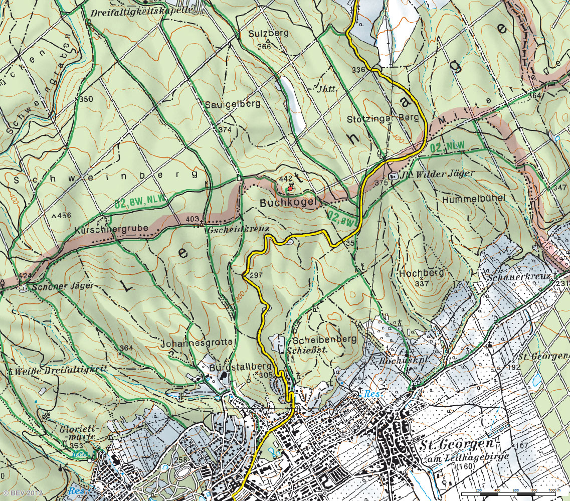 Vom Anger vor der Wallfahrtskirche Loretto steigt man auf der roten Markierung zum Beginn der Waldrandsiedlung an, hält sich dort rechts und gelangt über die Dreifaltigkeitskapelle in einen Sattel, von dem aus der Aufstieg zum Buchkogel und zur Warte erfolgt. Gehzeit 1½ Stunden. Nun zurück in den Sattel und geradeaus auf der Weitwandermarkierung bis zum Schönen Jäger. Der kurze Abstecher zur Kürschnergrube ist blau markiert. Gehzeit ab Buchkogel 1¼ Stunden.